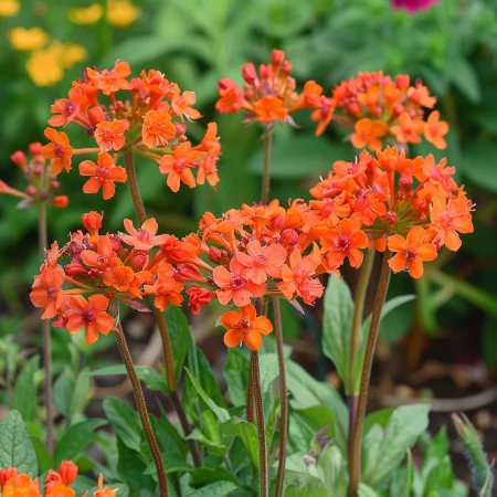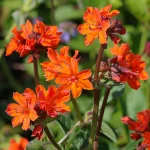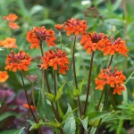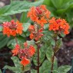 Многогодишно растение с оранжево-червени цветове върху силно облистени стъбла.